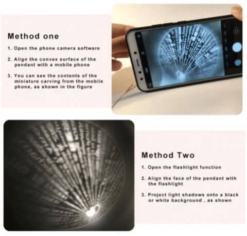 - Presenta el mensaje «Te amo» en 100 idiomas, grabado con el método de nano micro tallado. Puede verlo a través de cada lente estándar de cámara / teléfono inteligente. Proyecta el corazón central sobre un fondo negro con la linterna de tu cámara para mostrar tu amor.